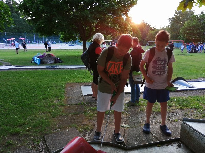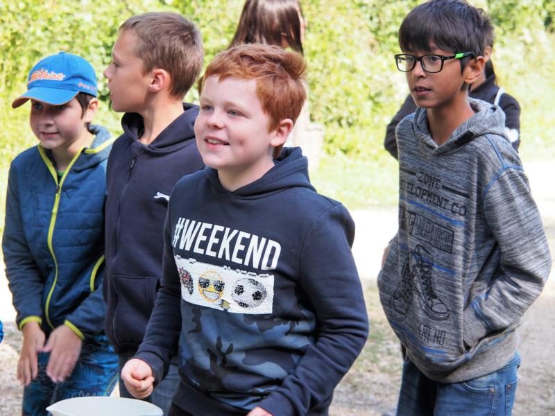 Nach einem kurzen gemeinsamen Fußweg zum Sportplatz begann das lang ersehnte Fußballmatch der dritten und vierten Klassen. Die Spieler wurden dabei von ihren Mitschülerinnen und Mitschülern voller Elan angefeuert. Trotz großem Bemühen und guter Chancen musste sich die Mannschaft der dritten Klassen den Viertklässlern schlussendlich 2:5 geschlagen geben. Um das Fußballmatch noch ausführlich besprechen zu können, gab es anschließend bei