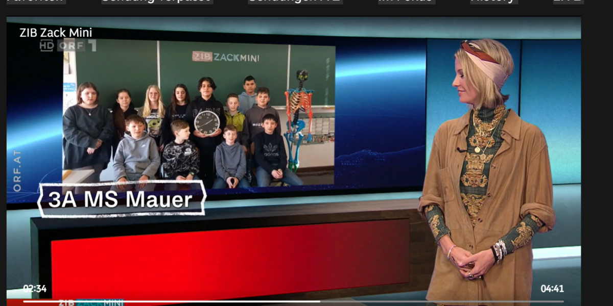 Die 3A sendete vergangenes Schuljahr eine Frage an die Redaktion der ZiB Zack Mini. Das lange Warten hat nun ein Ende – letzten Freitag (27.10.2023) wurde der Beitrag endlich gesendet. Die Freude ist bei den Schüler:innen der 3A und KV Frau Messner mehr als groß. In der ZiB Zack Mini sollen Kinder und Jugendliche in etwa fünf Minuten verständlich Hintergründe