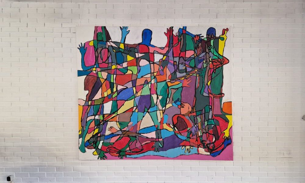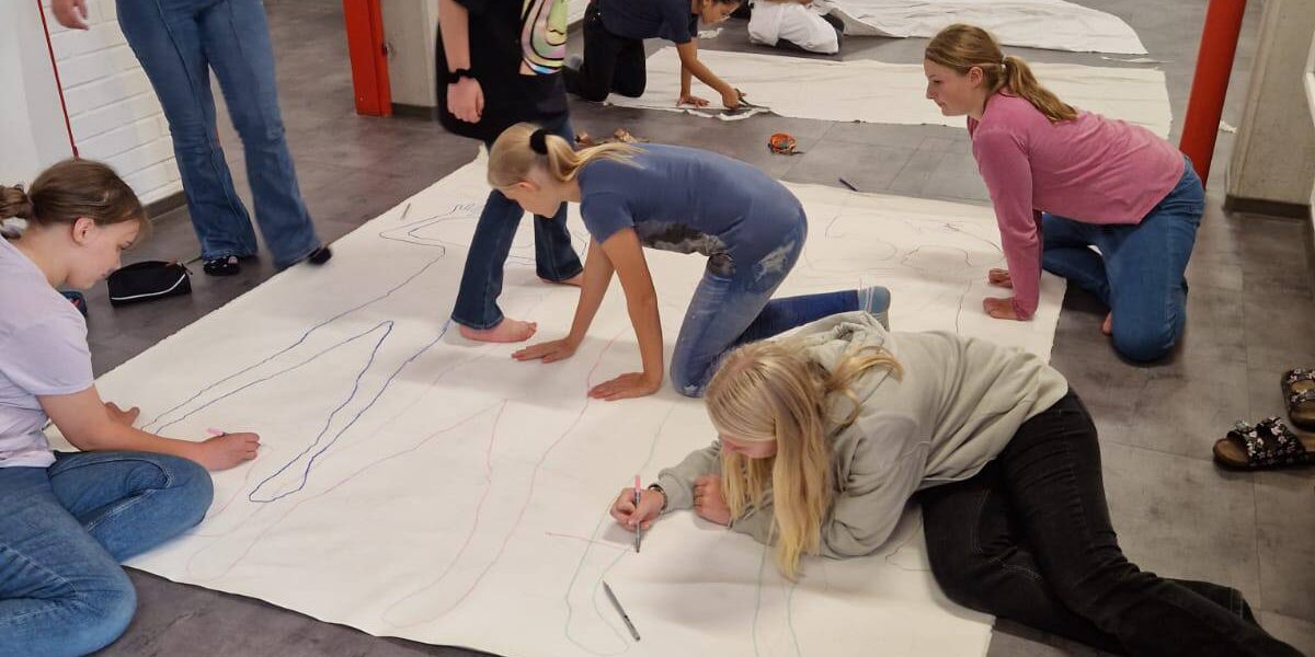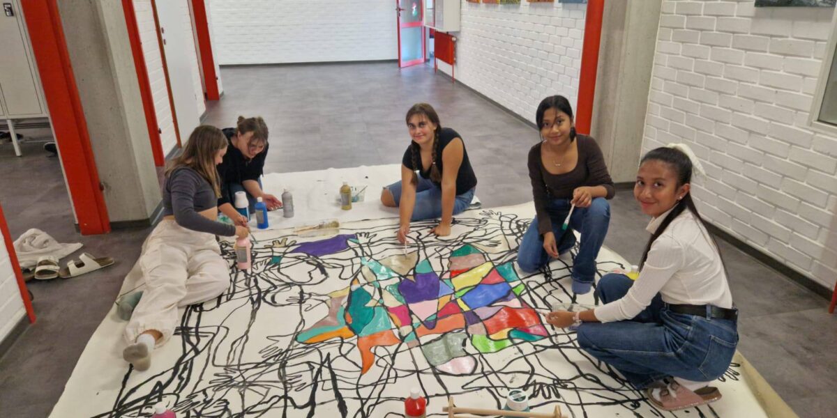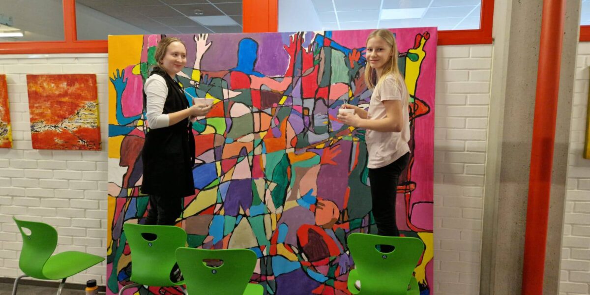 Im Rahmen des Freigegenstands „künstlerisches kreatives Gestalten“ hatten die Schüler:innen unter der fachkundigen Anleitung ihrer Lehrerin, Frau Petra Kammleitner, die einzigartige Gelegenheit, ein Gemeinschaftsbild zu gestalten. Der kreative Prozess begann damit, dass sich die Schüler:innen gegenseitig abpausten. Nachdem die Umrisse auf der Leinwand festgelegt waren, begannen die Schüler:innen damit, die Strich mit schwarzer Farbe nachzumalen. Dieser Schritt verlieh dem Kunstwerk